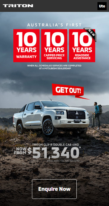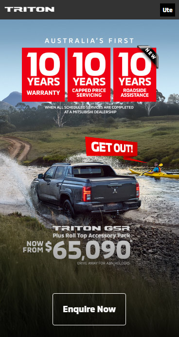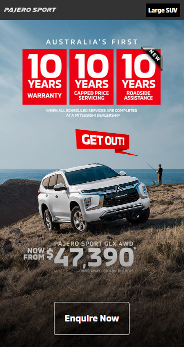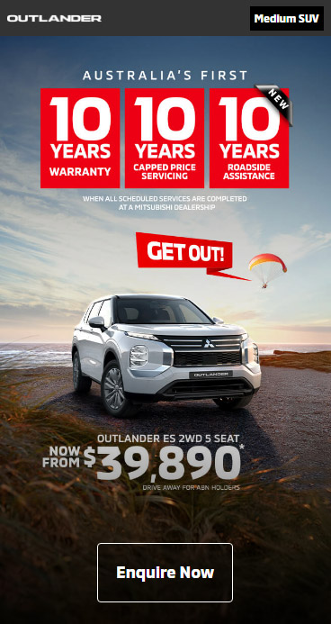 ⋄1 Up to 10 years from the date of first registration or 200,000km (whichever comes first) New Vehicle Warranty when all scheduled services are completed within the specified service intervals at a Mitsubishi Dealership. Otherwise, 5 years or 100,000km (whichever comes first) New Vehicle Warranty applies. Eligibility conditions and exclusions apply, full terms and conditions can be found here: https://www.mitsubishi-motors.com.au/owners/diamond-advantage/warranty.html