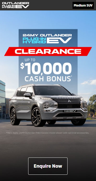*The Offer includes: (1) $10,000 Cash Bonus across new 24MY Outlander Plug-in Hybrid EV (PHEV) Exceed, Exceed Tourer and GSR OR (2) $5,000 Cash Bonus across new 24MY Outlander PHEV Aspire OR (3) $3,000 Cash Bonus across new 24MY Outlander PHEV ES. The Cash Bonus is to be redeemed by Customer at point of sale, as a reduction to the final negotiated price. Private and ABN buyers only. The Offer excludes Government, Rental, National Fleet customers as well as purchases utilising an operating lease or similar. Excludes used, novated lease and demo vehicles.
